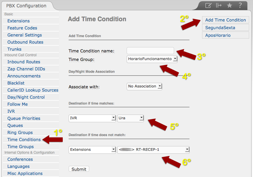 Na sessão Destination if time does not match nesse primeiro momento direcione para o ramal de atendimento, por exemplo, da recepção