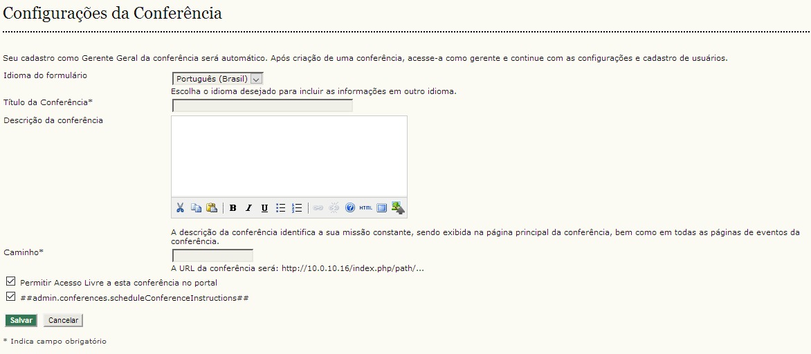 Esta opção permitirá adicionar informações referentes ao portal e não às conferências individualmente. Tais informações incluem o nome do portal, um texto de apresentação, uma opção de redirecionamento, uma descrição do portal, dados para contato, a extensão mínima de caracteres para as senhas e registro para coleta de dados e indexação. Você terá a oportunidade de fornecer detalhes sobre cada conferência num momento posterior.