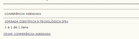 Acesse a página da conferência desejada e em “Administração da Página da Conferência” clique em “Conferências Agendadas”. A página resultante exibirá as edições já ocorridas e por ocorrer da conferência, e ainda a opção de marcar uma nova edição da conferência em “Criar conferência agendada”.