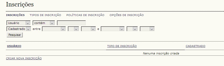 A tela de “Criar novo tipo de inscrição” possibilita fixar datas de abertura e encerramento de inscrições, opções de acesso (somente on-line, consulta aos impressos, frequência presencial na conferência, etc.). Diversas opções podem ser abertas completamente aos usuários, ou restringidas em parte.