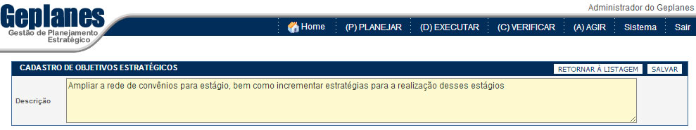 e aparecerá a tela de cadastro já preenchida com as informações do objetivo estratégico selecionado. Após editar os dados, clique no botão SALVAR.