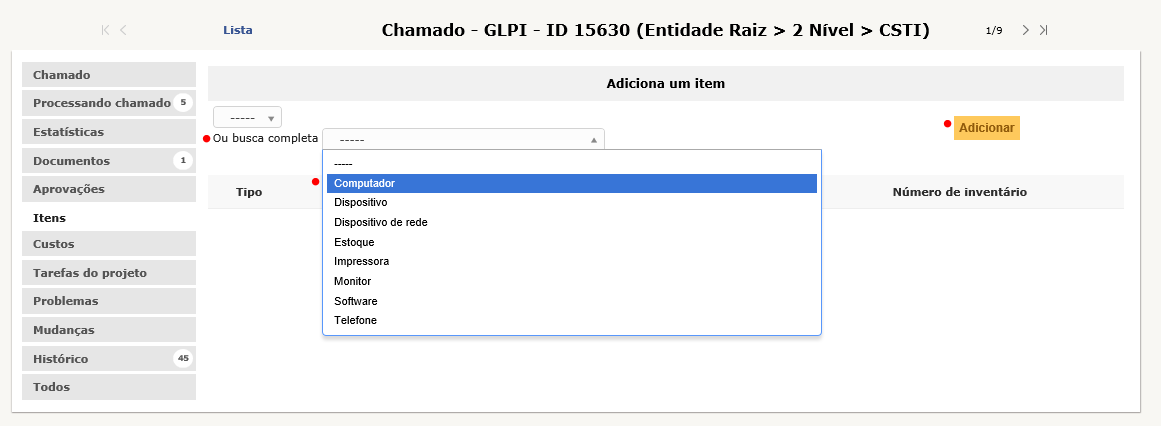 2) Na tela a seguir você encontra dois tipos de lista com itens que poderão ser associados ao chamado. Uma lista mais simples, e uma lista mais completa. Recomendamos utilizar a opção Ou busca completa. Após, clique no botão Adicionar.