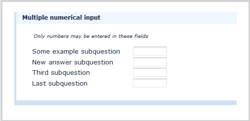 Uma questão do tipo “Equação” é usada em conjunto com outros tipos de questão (em geral, numéricas) para exibir a resposta de uma equação previamente definida pelo administrador do questionário com base nesses outros valores informados pelo usuário. A sintaxe das equações segue as regras do Expression Manager (EM). A seguir, acompanhe um exemplo ilustrativo para compreender o uso desse tipo de questão.