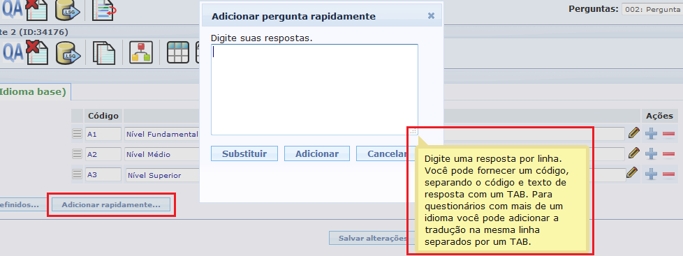 Ajuda: Campo opcional. É útil se a pergunta precisar de alguma explicação para ser respondida. Ao colocar um texto nesse campo, um ícone na forma de um sinal de interrogação aparece nas telas de entrada do questionário com o texto de ajuda ao lado.