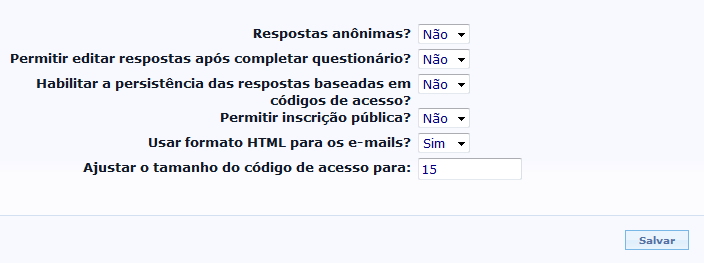 • Caso você deseje permitir a edição das respostas submetidas garantindo que cada usuário tenha apenas um registro na tabela de respostas, é necessário que seu questionário NÃO seja anônimo e que as opções “Habilitar a persistência das respostas baseadas em códigos de acesso?” e “Permitir editar respostas após completar questionário?” estejam marcadas como 'SIM'. Além disso, é necessário habilitar o uso de códigos de acesso.