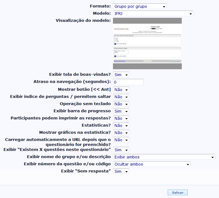 A tela de status de um questionário pode ser acessada a qualquer momento, através da lista de questionários disponíveis, na barra de Administração.