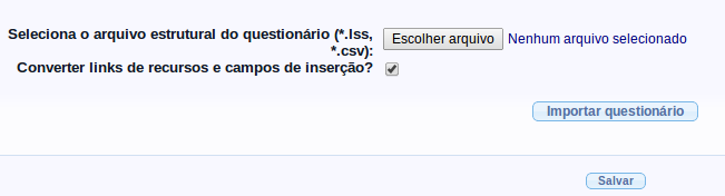 “Criar, importar ou copiar questionário” através da guia “Importar”. Clique no botão para pesquisar e escolher o arquivo LSS/CSV e, então, clique no botão “Importar questionário”. O processo de importação lê arquivos com formato CSV, criados pelo LimeSurvey. Dessa forma, é possível importar questionários de versões anteriores. A importação renumera os identificadores do questionário, grupos, perguntas, respostas e condições, de modo que eles se relacionem. Veja a seção Exportando um Questionário para maiores informações.Ao se concluir a criação do questionário, sua tela de status é exibida em seguida. As informações mostradas são, basicamente, um resumo das principais configurações do questionário. A maioria delas já é definida no momento da criação, mas é possível editar algumas características posteriormente. No exemplo abaixo, perceba que o sistema informa que o questionário ainda não pode ser ativado, pois é necessário adicionar grupos de questões e perguntas.
