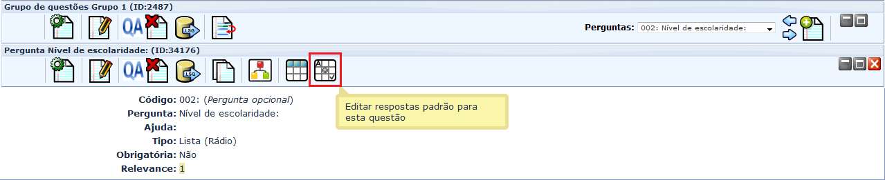 Após adicionar as possíveis respostas para uma pergunta e salvar as alterações realizadas, é possível editar as respostas padrão (default) para tal pergunta clicando no botão apropriado na barra de menu da questão (ícone destacado na figura a seguir). Neste caso, quando o questionário é aberto, as perguntas que possuem uma resposta padrão aparecem com tais informações já preenchidas/marcadas. Por padrão, não há valor padrão.