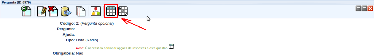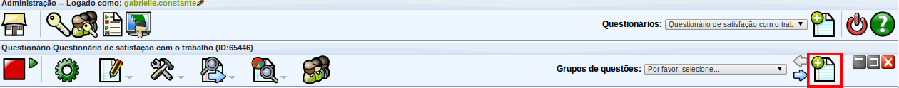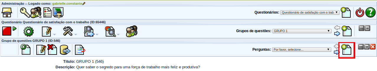 Uma vez tendo criado um ou mais grupos de perguntas, pode-se começar a adicionar as perguntas dentro de cada um deles. Para criar uma questão, deve-se clicar no ícone à direita da barra de menu de grupos de questões – botão “Adicionar nova pergunta ao grupo”.