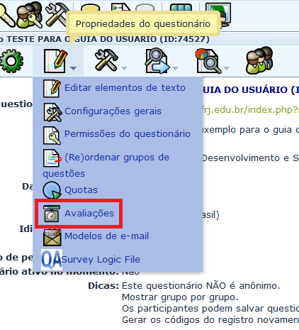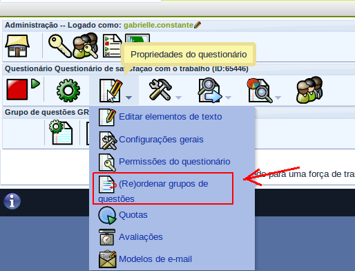 Quando há mais de um grupo de perguntas, é possível reordená-los clicando no ícone “Propriedades do questionário”, na barra de menu do questionário. O ícone para alteração da ordem dos grupos de perguntas só estará ativo quando houver mais de um grupo.