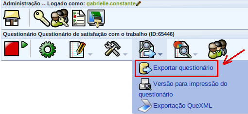 Naturalmente, tendo concluído um questionário com dezenas de perguntas que lhe tomaram 5 dias para criar, você deve desejar fazer um backup. O botão Exportar o questionário na barra de botões do questionário irá carregar todos os grupos de perguntas, perguntas, opções de respostas e condições do seu questionário em um arquivo padrão CSV. Esse arquivo poderá ser usado novamente depois, usando a função 'Importar Pesquisa'. O arquivo não contém as respostas enviadas. Estas só podem ser exportadas de pesquisas ativadas pelo menu Visualizar as respostas do questionário – Exportar resultados para aplicativo.