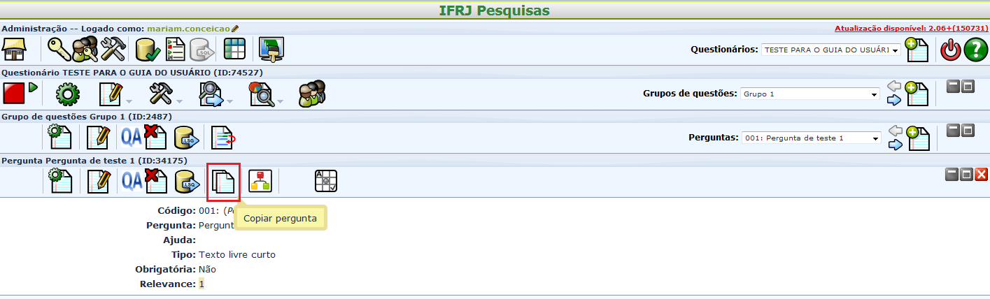 Existe a possibilidade de se copiar perguntas já existentes no questionário. Para tanto, deve-se clicar na opção “Copiar pergunta” na barra de menu da questão, conforme indicado na figura abaixo. As características da pergunta original podem ou não ser modificadas.