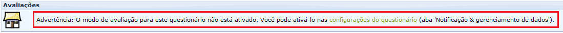Ao se concluir a criação do questionário, sua tela de status é exibida em seguida. As informações mostradas são, basicamente, um resumo das principais configurações do questionário. A maioria delas já é definida no momento da criação, mas é possível editar algumas características posteriormente. No exemplo abaixo, perceba que o sistema informa que o questionário ainda não pode ser ativado, pois é necessário adicionar grupos de questões e perguntas.