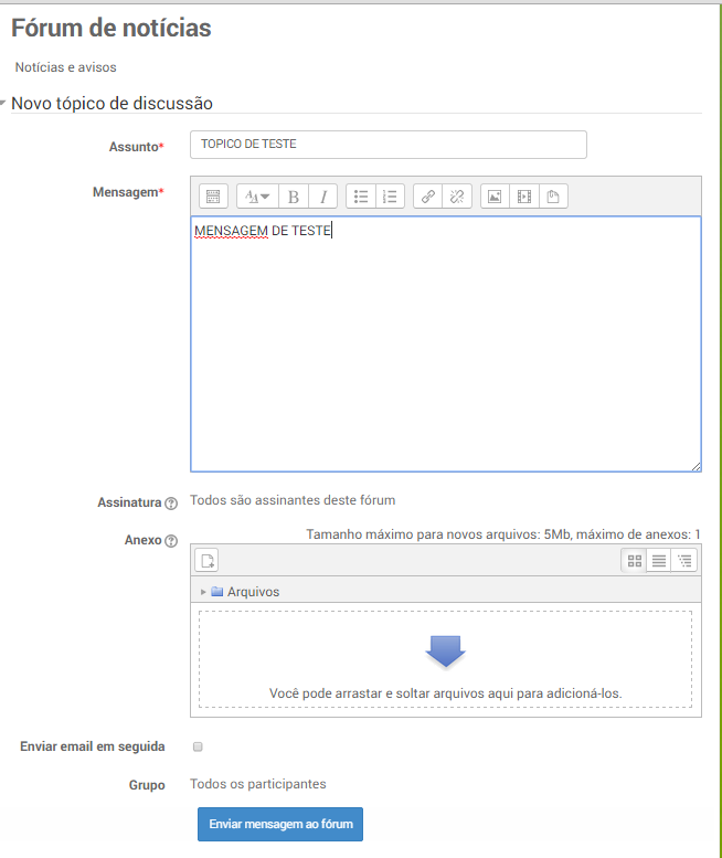 Ao clicar em **Adicionar Novo Tópico**, pode-se definir o assunto, o conteúdo da mensagem e até mesmo anexar arquivos a mesma. Por padrão, mas podendo ser modificado, todos os inscritos no curso receberão a notificação da criação do novo tópico.