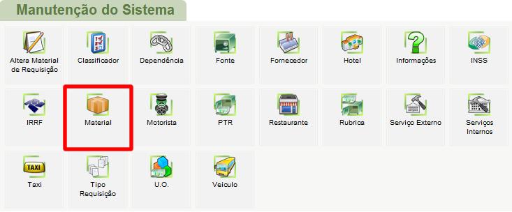 O sistema retornará a tela Manutenção do Sistema, nela selecione a opção Material.