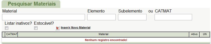 Nesta tela, poderá ser feita duas ações, Pesquisar Materiais e Inserir Novo Material.