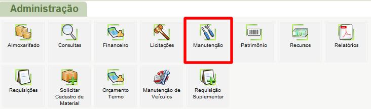 O sistema retornará a tela do menu de Administração, nela selecione a opção Manutenção, feito isto o usuário acessará o módulo referido.