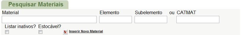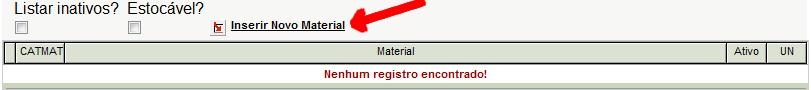 Nesta tela, poderá ser feita duas ações, Pesquisar Materiais e Inserir Novo Material.
