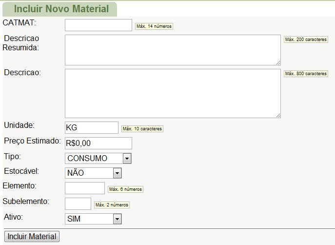 Tipo: tipo do material a ser incluído (Consumo ou Permanente).