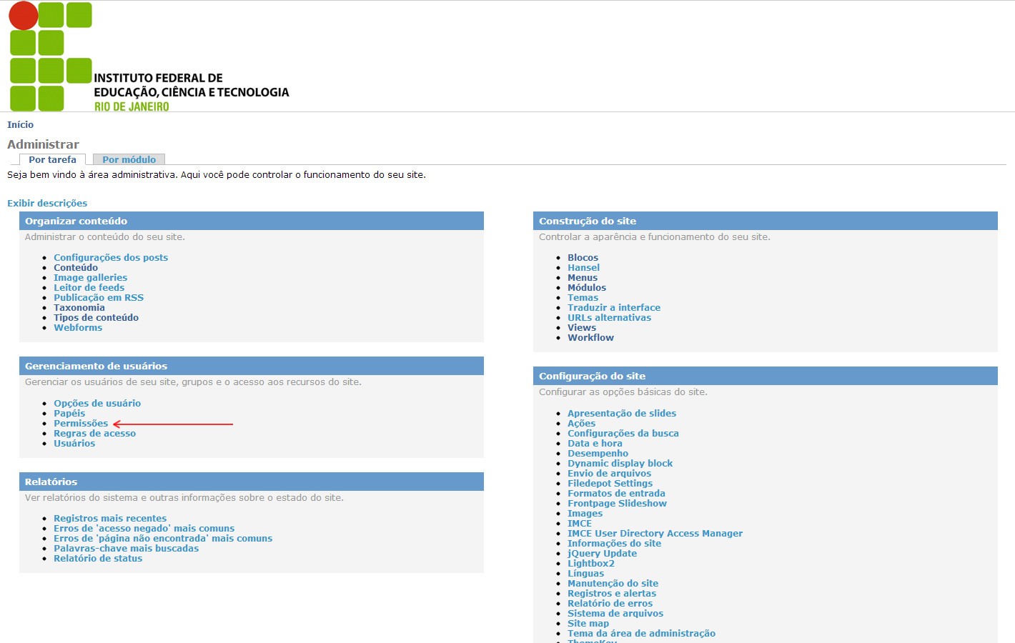 Para adicionar uma nova 'Permissão', deve-se primeiramente acessar o link http://www.ifrj.edu.br/admin .