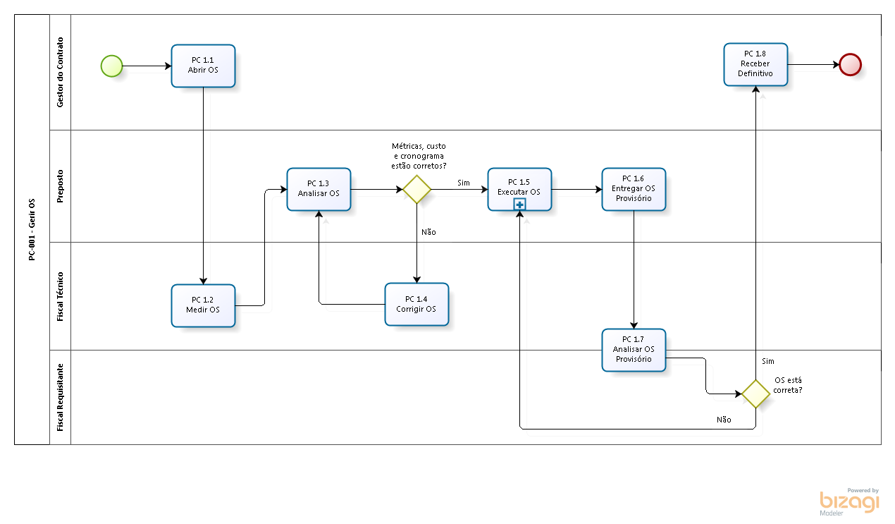 | PC 1.1 - Abrir O.S. | Gestor do Contrato | É através dessa atividade que as Ordens de Serviço serão abertas, essa atividade é realizada através da tarefa PC - O.S., do Redmine. Consultar o manual pc1.1_abrir_os_manual.pdf. |